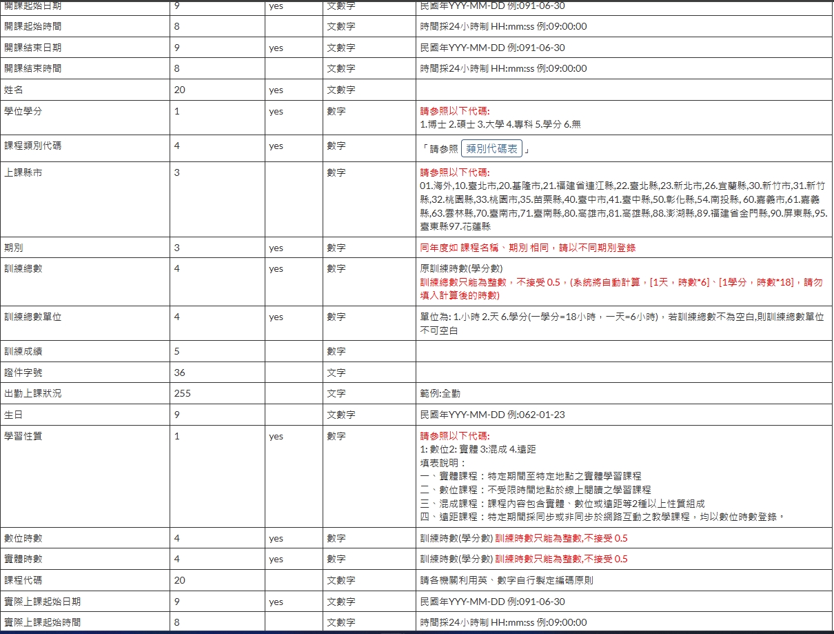 CSV檔案格式-登錄學習時數(環境教育時數)