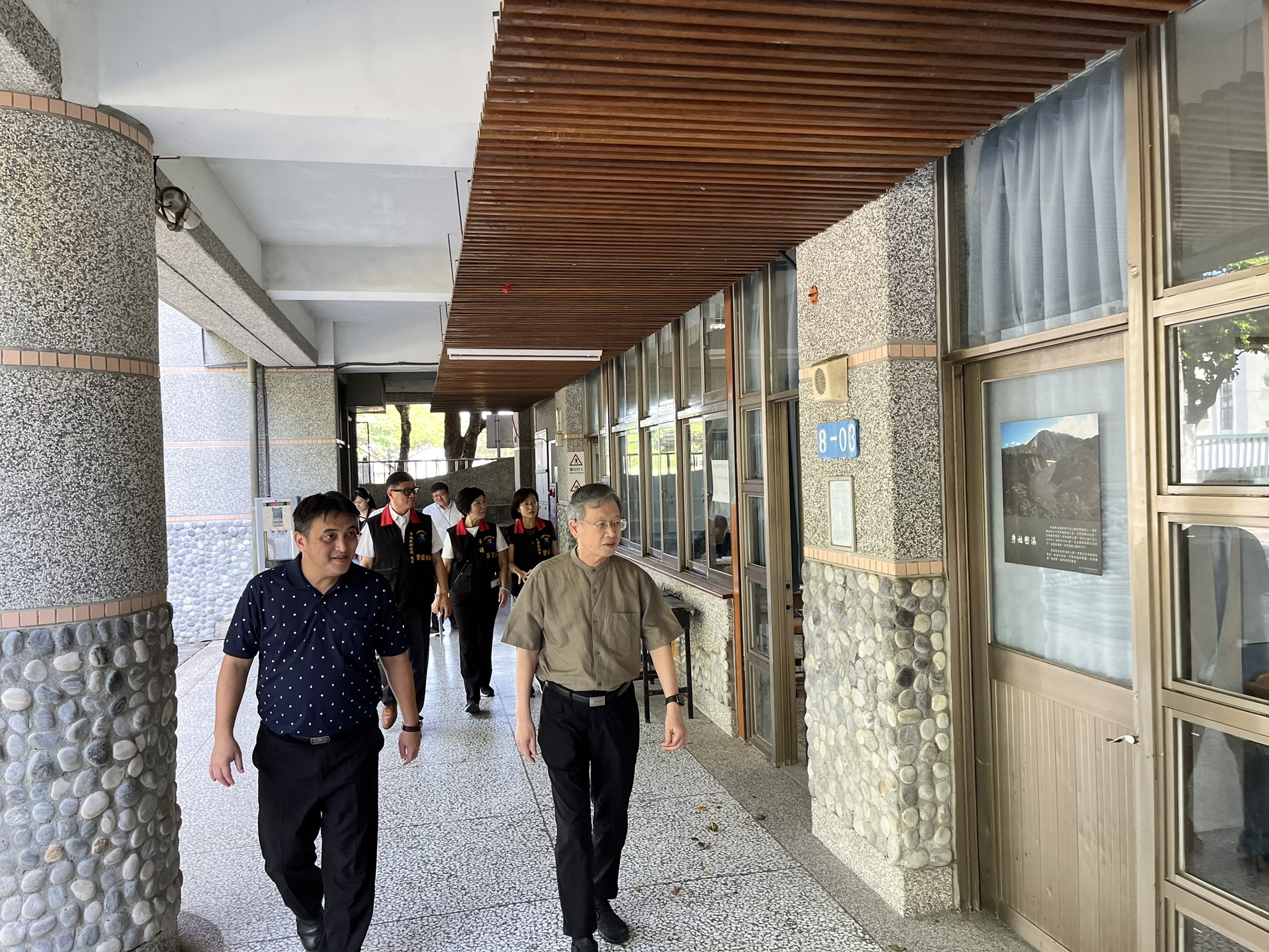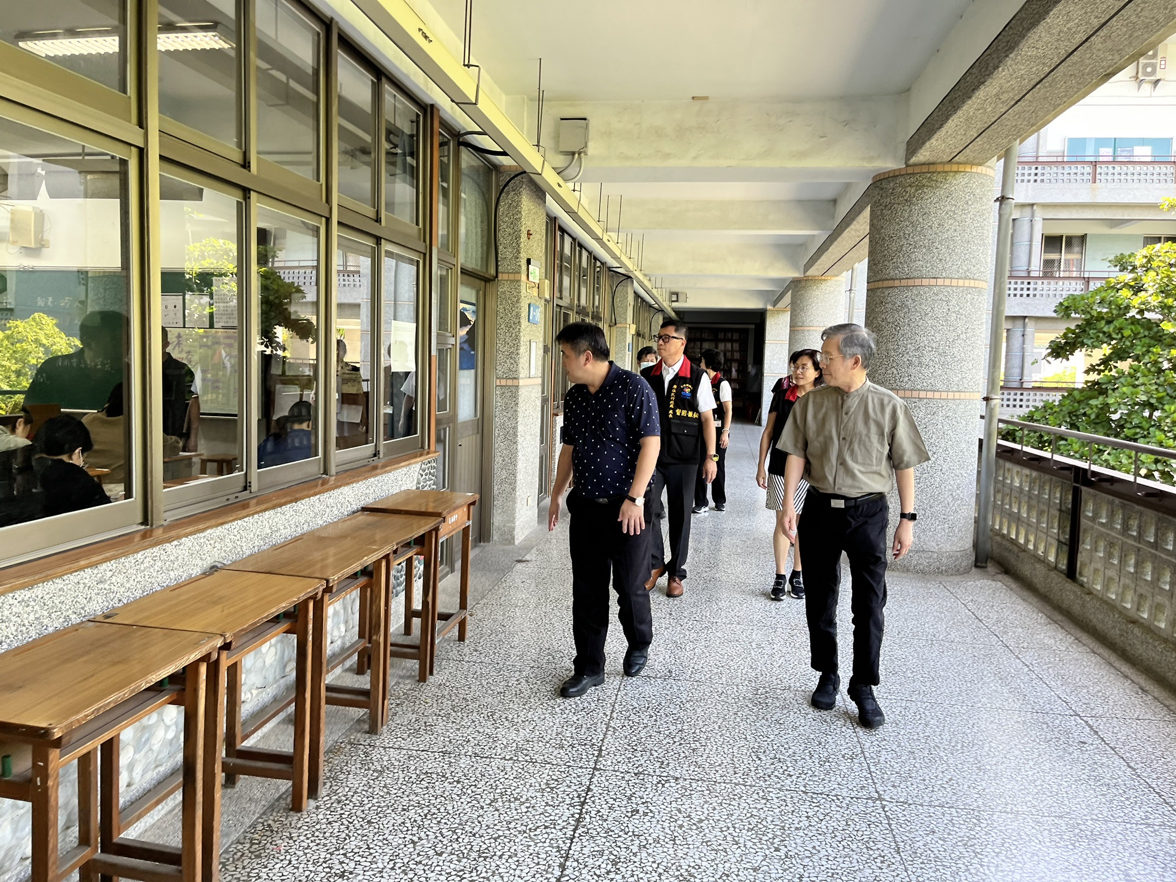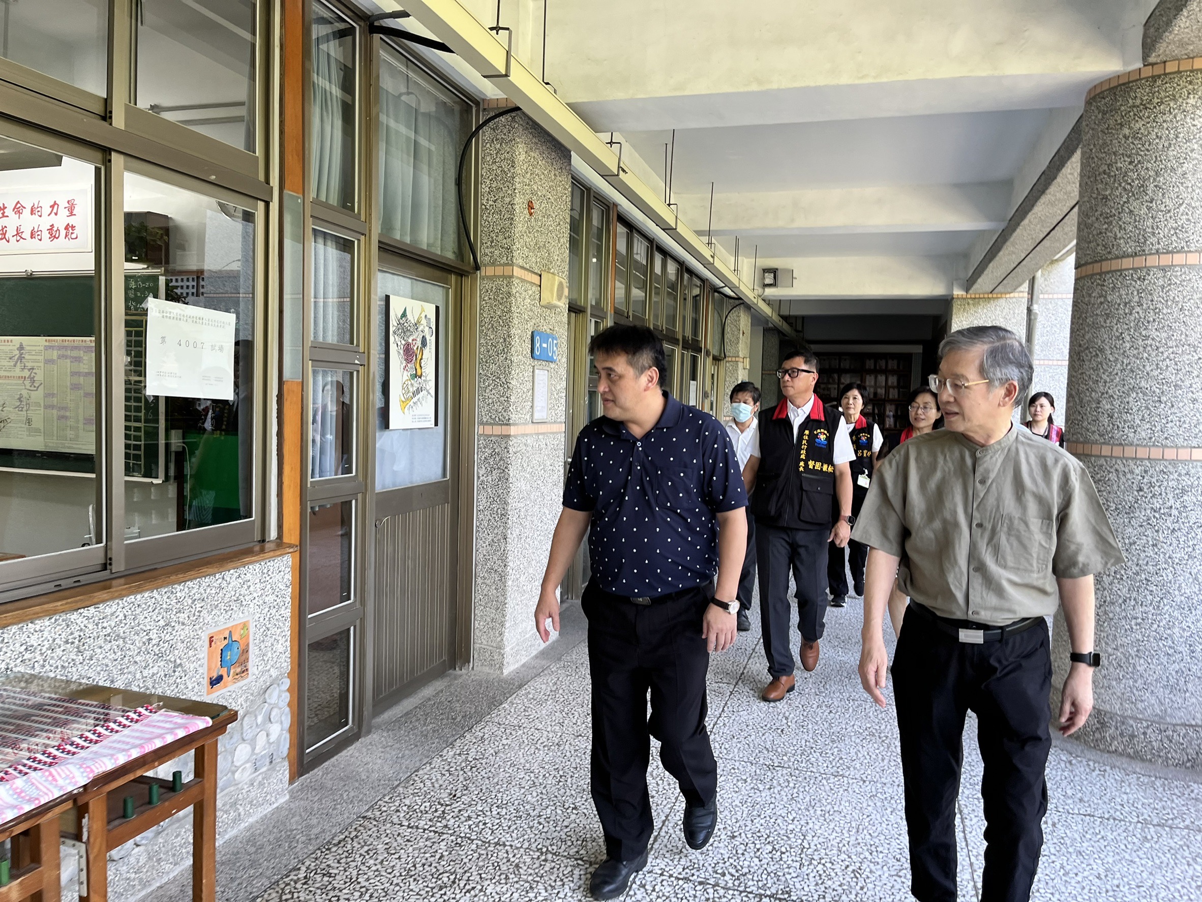 花蓮考區典試委員陳錦生、在原住民族委員會政務副主任委員蘇佐璽、考選部專門委員翁文斌、花崗國中校長李恩銘、縣府人事處處長曾淑芬及原住民行政處處長督固.撒耘等人陪同下巡視花崗國中試區,委員對於試區環境予以肯定,同時慰勉為國家考試付出的試務中心同仁。
